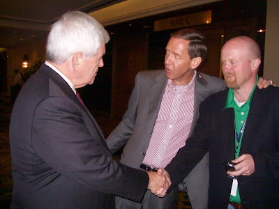 A slightly less random meeting in Hilton hallway, as Newt Gingrich is introduced to Carl Cameron’s producer. Also not completely random . . .