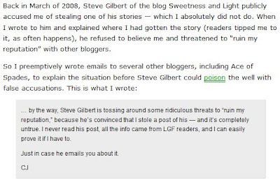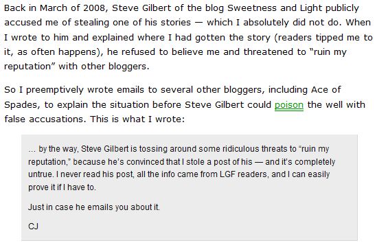 Johnson recounts a dust-up in which Steve Gilbert at Sweetness & Light accused Johnson of “stealing one of his stories,” an accusation Johnson denied. But when Gilbert, per CJ, “threatened to ‘ruin my reputation’ with other bloggers” Johnson “preemptively wrote emails to several other bloggers.”