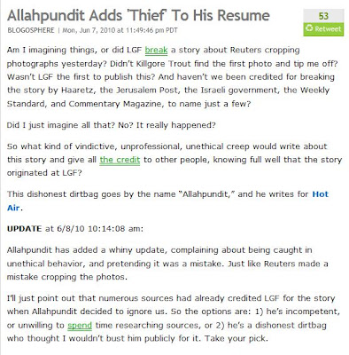 “So what kind of vindictive, unprofessional, unethical creep would write about a story and give all the credit to other people, knowing full well that the story originated at LGF?