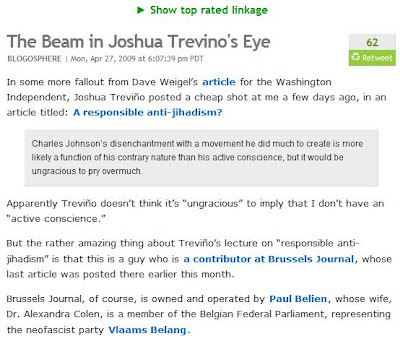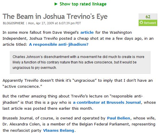 Note that second sentence, which Johnson omitted when quoting Trevino at LGF. What Trevino appears to be saying is that he felt Johnson (and Johnson’s anti-jihad comrades) were often too extreme in their rhetoric even before Johnson and LGF turned on Geller, et al. And, as Weigel noted in a follow-up post, Johnson’s qualms about Belgian nationalism hadn’t prevented him from lamenting the banning of Vlaams Blok in November 2004: