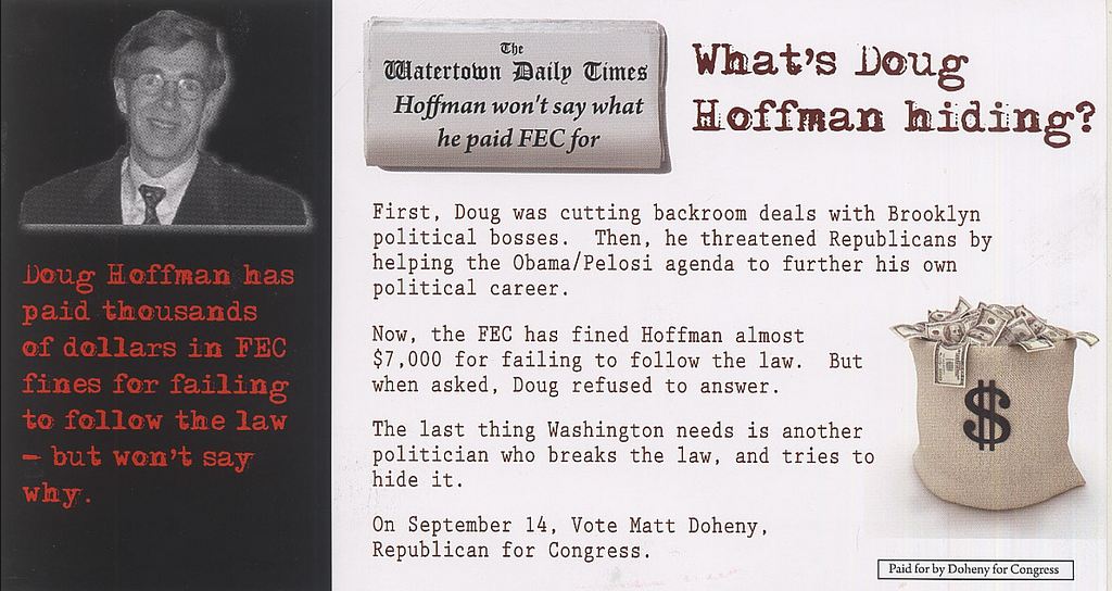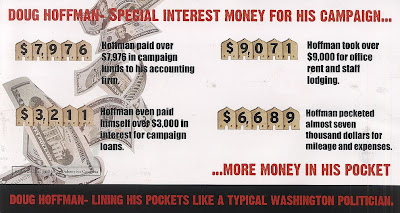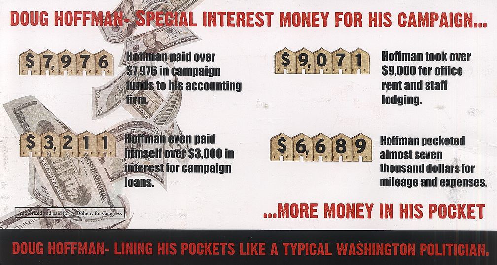 “Doug Hoffman isn’t even in Congress yet and he’s already lining his pockets with tens of thousands of dollars. . . . Doug Hoffman — lining his pockets like a typical Washington politician.”