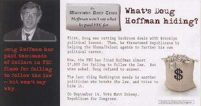 As I told you before, Doheny invested $1 million of his own money in the campaign and yet, as the Sept. 14 primary approached, it appeared that Hoffman would win anyway. That’s when the Doheny campaign sent out these two mailers: