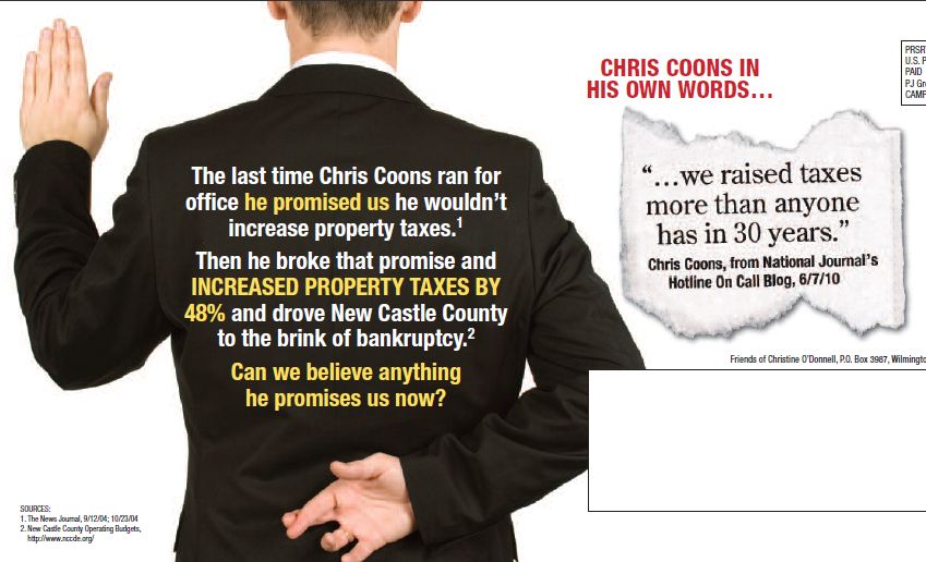 As National Journal‘s Hotline On Call has reported, Coons “spearheaded one of the largest tax increases in state history” in New Castle County. The O’Donnell mailer, sent to tens of thousands of Delaware voters, notes that Coons promised during his 2004 campaign not to raise property taxes: “Then he broke that promise and increased property taxes by 48% and drove New Castle County to the brink of bankruptcy. Can we believe anything he promises us now?”