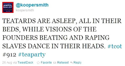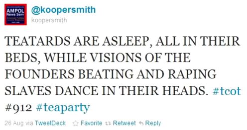 Here, without any evident provocation, Koopersmith puts an outrageously insulting message on the #TeaParty hashtag. Koopersmith is a 62-year-old liberal lawyer who is a founder of the liberal Web site American Politics Journal. You may see, for example, how he writes about Ann Coulter as engaged in ” libel and slander against majority American values.” Koopersmith has now adapted his act to Twitter. Here is how he responded to my Tweet mentioning him in connection with the TwitterGate video: