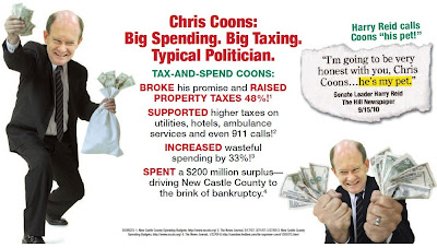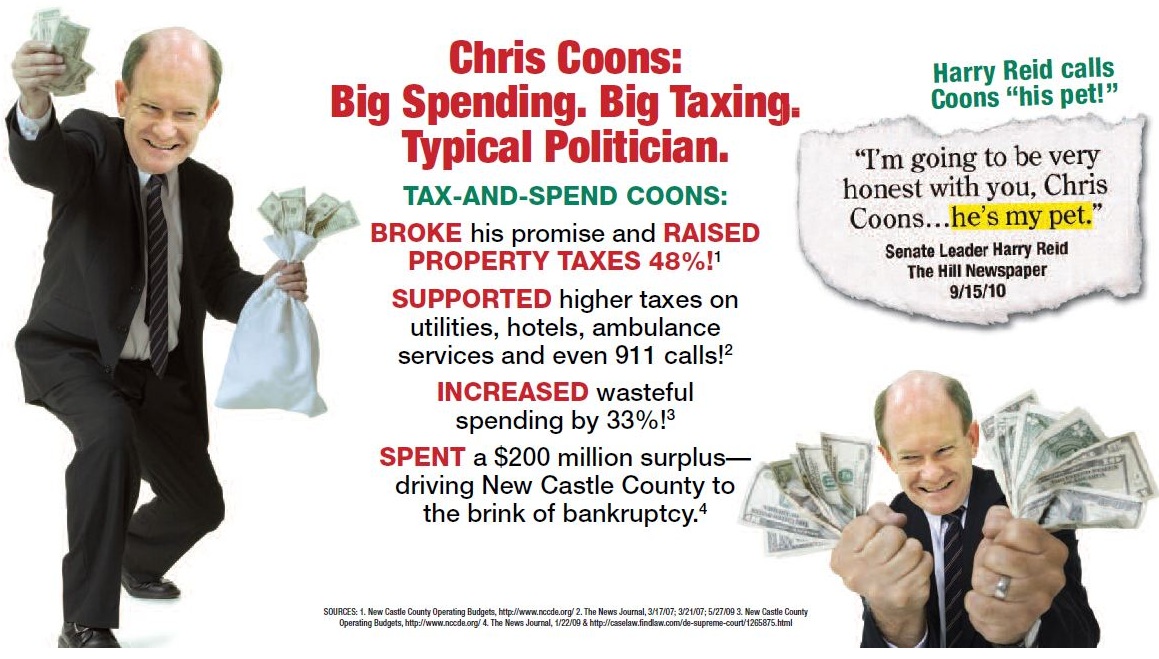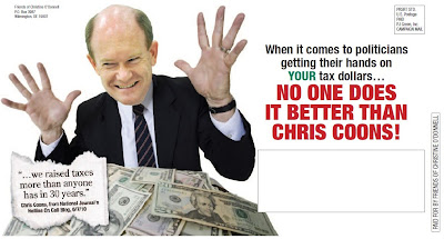 In her second statewide campaign mailing, Delaware Senate candidate Christine O’Donnell reinforces her message about Democrat Chris Coons’ record of raising taxes in New Castle County: “When it comes to politicians getting their hands on your tax dollars . . . no one does it better than Chris Coons!”