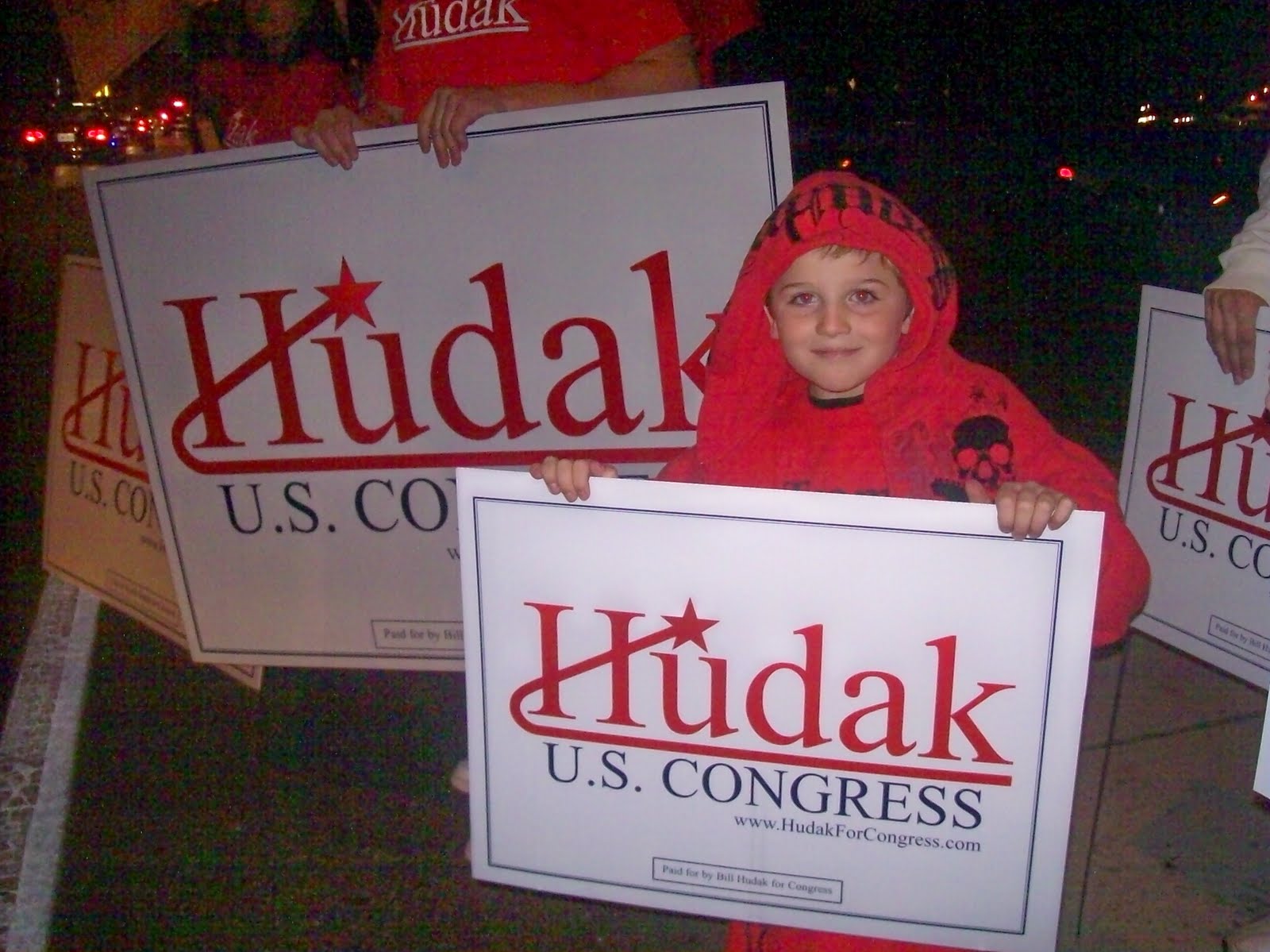 A young Hudak supporter holds a sign in front of the auditorium in Beverly where the debate with Tierney was held.