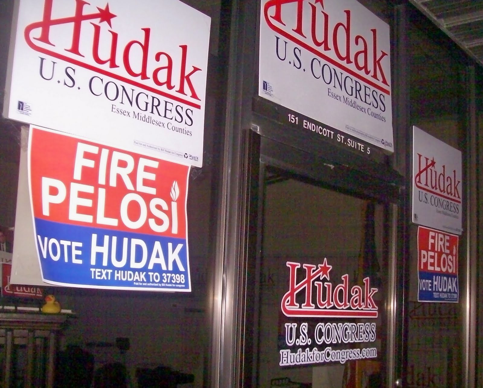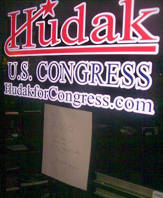 This is the front door of the Bill Hudak for Congress campaign headquarters in Danvers. The note taped to the door says the headquarters closed early because of the debate with Democrat John Tierney in nearby Beverly.