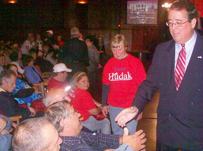 Bill Hudak shakes hands with supporters before Thursday’s debate.