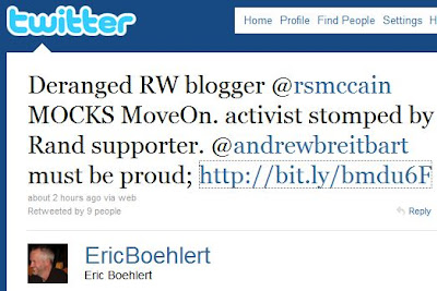 A very clever guilt-by-association tactic, you see? In point of fact, Andrew Breitbart immediately condemned the Kentucky head-stomping via Twitter and yet Boehlert, with this insinuation that Breitbart “must be so proud,” tries to implicate Breitbart with words and deeds he neither authorized nor endorsed.