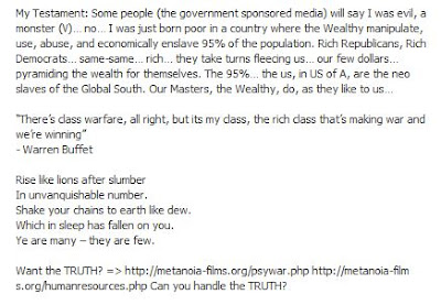 Some people (the government sponsored media) will say I was evil, a monster (V)… no… I was just born poor in a country where the Wealthy manipulate, use, abuse, and economically enslave 95% of the population. Rich Republicans, Rich Democrats… same-same… rich… they take turns fleecing us… our few dollars… pyramiding the wealth for themselves. The 95%… the us, in US of A, are the neo slaves of the Global South. Our Masters, the Wealthy, do, as they like to us…