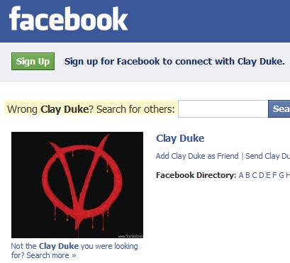 UPDATE IV: Thanks to a Twitter friend for pointing out the “V for Vendetta” motif on Clay Duke’s Facebook page: