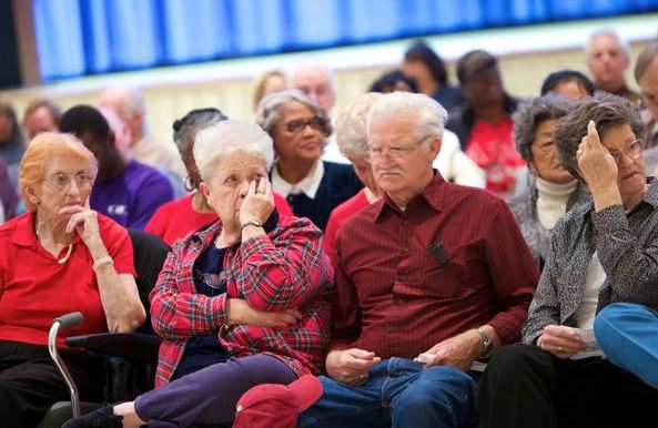 You probably don’t see much of a racial angle there, except for the single reference to “white flight.” It’s not until you look at the photos by Meggan Haller that the situation comes into clearer focus. Here is a group of retirees who showed up at a recent city council meeting to ask for some payment for Christmas: