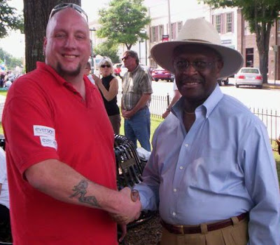 That’s my cousin Brian Buchanan, who lives near Atlanta and — last time I talked to him — was working as a nightclub bouncer. He sent me that photo by Facebook and told me that he took our cousin Pepper Ellis-Hagebak to hear Herman speak on the square in LaGrange, Ga., in May. (I’d imagine Pepper’s head exploded. She’s kind of a liberal.) If Herman ever needs personal security, I’m sure Brian would be available.