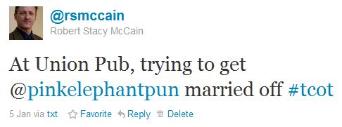 Tabitha (a/k/a Pink Elephant Pundit) is New Media director for FreedomWorks. She’s also from North Carolina and 25 years old — which makes her practically an old maid by down-home standards. So I started in on my usual pro-marriage encouragement harassment, telling these young folks they ought to run off and get married post-haste. And that’s when I Tweeted this: