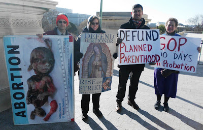 UPDATE VI: Leaving the Dirksen building, I continued up toward the Capitol, crossing Constitution Avenue. I walked south across the east front of the Capitol — past the rows of SUVs and town cars waiting to convey congressional leaders to their post-swearing-in destinations — and when I got to the other side, near Independence Avenue, I saw a small group of pro-life protesters: