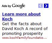 UPDATE: Wow, you can’t say those Koch people aren’t Internet-savvy. As soon as I posted this, I noticed a Google ad in the sidebar: “Learn More About Koch,” with a link to the Web site of the David H. Koch Charitable Foundation.