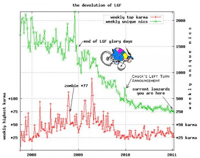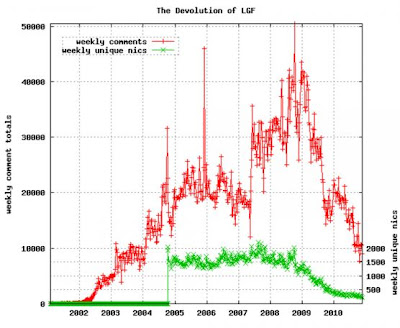 The real freefall began in 2009 and, by late that year, the average number of “unique nics” commenting in a week fell below 500 for the first time. By early 2011, the core commenting community at LGF was down to about 250 people — which is to say, about one-eighth of what it had been in 2007.