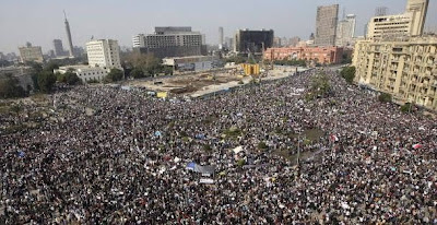 “An estimated one million people have gathered in Tahrir Square . . . fulfilling the hopes of opponents of Hosni Mubarak’s regime who wanted to make this the biggest protest since demonstrations began a week ago. Protesters believe this could be the last few hours of Mubarak’s rule, but it remains unclear whether they will march on the presidential palace as planned.”