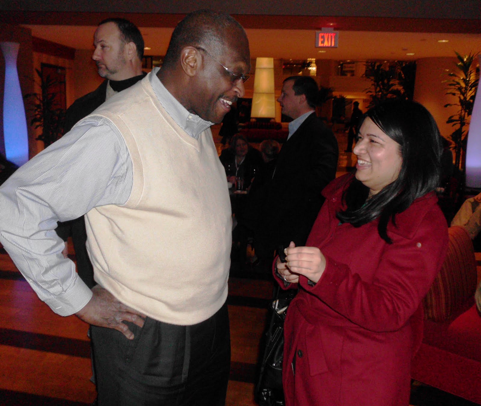 Atlanta talk-radio host and GOP presidential candidate Herman Cain talks to conservative activist Ruth Malhotra. After Cain arrived last night, he was quickly surrounded by CPAC attendees eager to shake his hand and get their photos taken with the guy I introduced to my friends as The Next President of the United States.