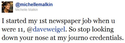 Weigel then goes on to bullet-point the contents of Malkin’s latest column, “Hate-a-rama: The vulgar, racist, sexist, homophobic rage of the Left.” He then wrote, “This isn’t really reporting. This is googling,” a sneer he retracted after Malkin pimp-slapped him and pointed out that she had done follow-up interviews with various victims of left-wing protest thuggery.