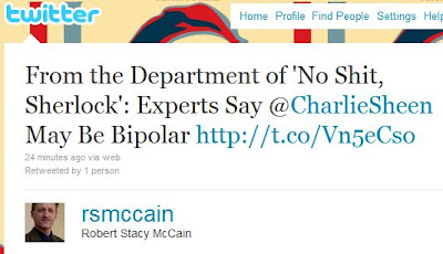 I submit that no experienced psychologist who watched Sheen’s recent interviews could dispute that he is exhibiting multiple symptoms of manic-phase bipolar disorder. But the symptoms of a dude on the deep end 0f a long cocaine binge are quite similar, so until they can get Sheen into a secure in-patient facility and ascertain that he’s not coked out, a diagnosis of his underlying mental health will have to wait.