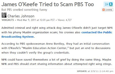 Note the presumption that PBS is the innocent victim of the “right-wing” bad guy O’Keefe. We haven’t seen the video, and therefore have no idea what actually happened at the meeting, but Charles Johnson knows who the villain is!