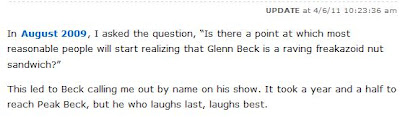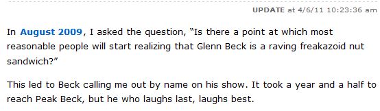 So, in August 2009, Charles Johnson labeled Beck a “raving freakazoid nut sandwich” and now in April 2011 — which is to say, 19 months later — claims vindication, “laughing last.”