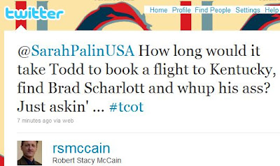 It’s crazy, is what it is, and the craziest part of it is that these fools are calling Todd Palin a liar. By my calculations, the campus of Northern Kentucky University is just about a 15-minute drive from the airport in Florence, and if Professor Scharlott gets the ass-whuppin’ he deserves, don’t say I didn’t try to warn him.
