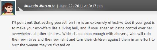 As one blogger observed: “It’s pure feminist evil. . . . A man whose life was destroyed by anti-family courts burns himself to death, but Marcotte thinks a woman is the hardest hit.”