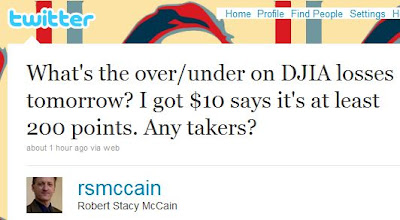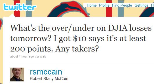 […] Robert Stacy McCain is betting $10 that it falls 200 points or more. […]
