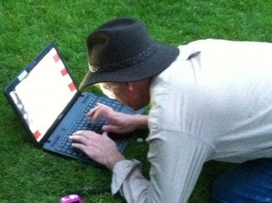 UPDATE V: The first few photos at the top were uploaded while we were still at Rollins Park, where I was poaching WiFi from the Tea Party Express. Several people — including Weigel and Andrea Shea King — thought it was amusing to see me working on the grass and shot some photos: