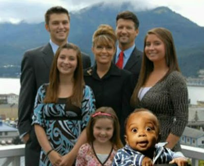 Yeah RSM you’re offended  by Sack’s joke, but not so offended that you can’t photoshop a pic of a little black kid into the foreground of a Palin family photo, right?