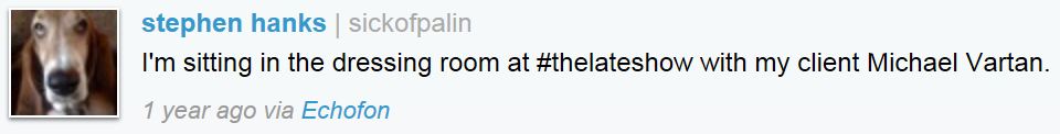 What you see here is the sloppy recklessness of liberals: Hanks included his name on his “SickOfPalin” Twitter account and used that account to Tweet about his professional client, so as to dragoon the client into the service of Hanks’s anti-Palin politics.
