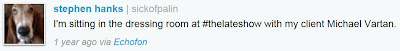 I’m sitting in the dressing room at #thelateshow with my client Michael Vartan
