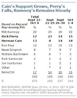 A new Pew Poll shows the astonishing surge for Herman Cain in the GOP field since the Sept. 22 debate in Orlando. Cain trailed Rick Perry by four points Sept. 22-25, but by Oct. 1-4 Cain led Perry 18-15, while front-runner Mitt Romney softened slightly, declining from 25% to 22% in the span of little more than a week. If this trend continues another two weeks — as the Republican candidates meet again in debates Oct. 11 in New Hampshire and Oct. 18 in Las Vegas — the contest may begin to be viewed nationally as a race between Romney and Cain.