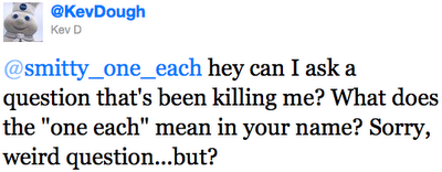 If you want to over-think it, and you should not, consider it an oblique, smirking statement about the de-humanizing, anti-individual nature of modern life. My humanity is reduced to some stock ‘Smitty’ character, which comes from the supply department in a ‘one each’ unit of issue.