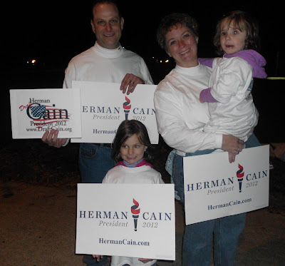 This family of Cainiacs was doing a standout by the entrance to Wofford College, surrounded by about 50 screaming Ron Paul fanatics. I’ve got video of the Paulistas and will upload shortly.