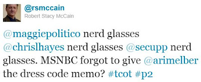 BTW, the “nerd glasses” motif with younger TV talking heads seems to me an attempt to convey seriousness, to deflect the instinctive reaction of older viewers: “Who are these kids jabbering about politics? What the hell do they know? Get off my lawn!”