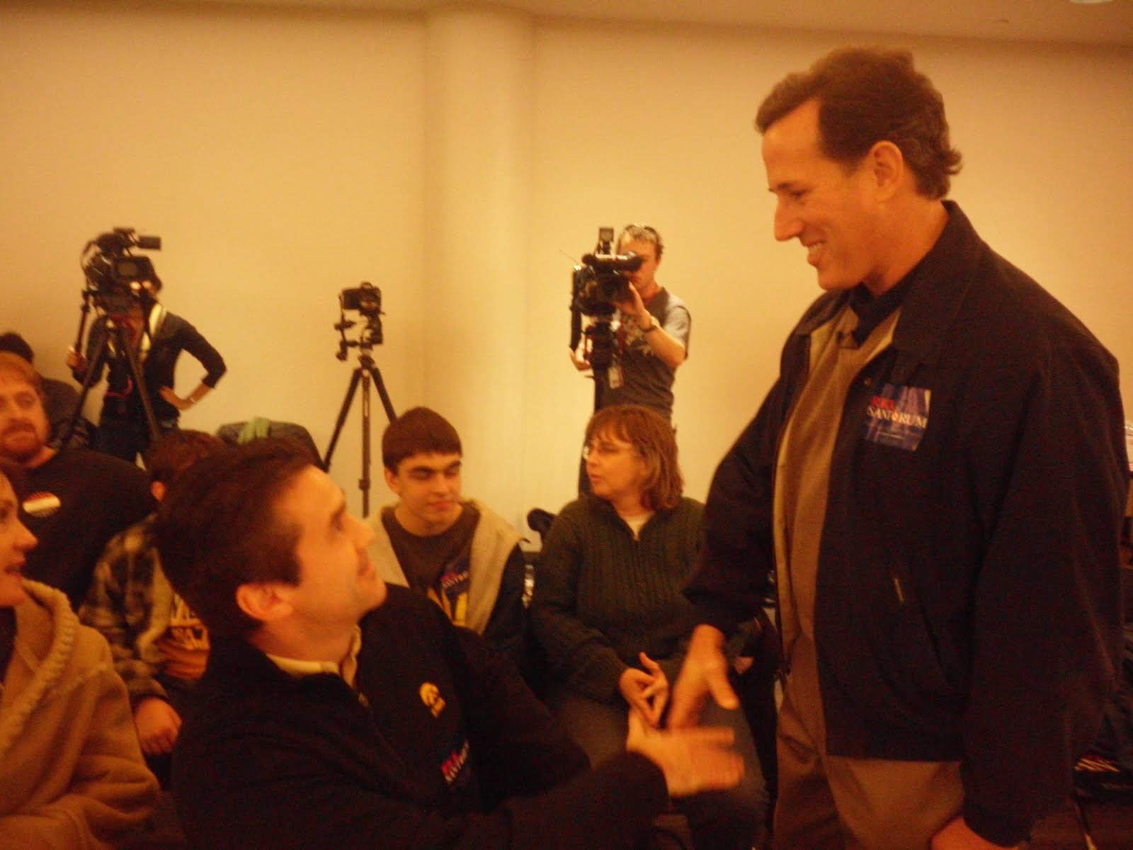 UPDATE III: Here’s a photo of Senator Sanatorum shaking hands with Iowans before his town hall meeting here in Cedar Rapids: