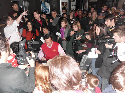 UPDATE: Here we see the candidate — wearing his brand-new Iowa State red sweater-vest — surrounded by the media mob: