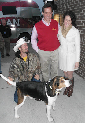 Rick Santorum poses with Tizzy, a dual champion Treeing Walker Coondog, Tizzy’s owner Jon Hathaway of Des Moines, and the lovely Elizabeth Santorum.