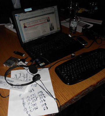 UPDATE 12:20 a.m. CT: Finally collected the beer that Santorum’s Iowa field director Jake Braunger had promised me. That 24-year-old kid just became an American political legend. Not for buying me a beer, but for leading the grassroots army which — as of this point, with 99% of the precincts reporting — has Santorum winning with an 18-vote margin.