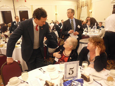 The media were banned from the actual dinner — but I was a guest of Mike Rogers of Granite Grok, so I got this picture of Senator Santorum greeting Mike’s wife. By the way, the entre at the dinner was prime rib served so rare, it still had a pulse.