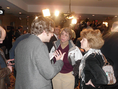 Reporters compulsively check their Twitter feeds on their 4G phones. The lady in the black-and-white coat is Shushana Walshe of ABC News.