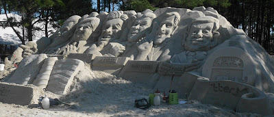 The sand sculpture is a nice idea, but, look at the full-size version of the picture: Perry looks like Reagan, Santorum like John Kerry, the guy to Perry’s right looks like Teddy Kennedy – only Newt looks like Newt.