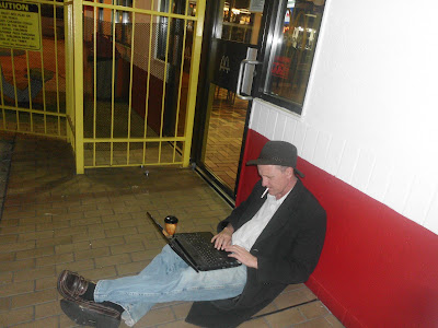 All I needed enough time to get on my e-mail program and send the column to my editor, but the Internet connection had timed out (as it does after two hours) and they were ready to clear the dining room. But the guy mopping the floors told me that, if I sat right outside the door, I could still reach the WiFi signal, so that’s what I did. Lisa Graas called while I was sitting on the sidewalk, and we talked for a few minutes while I got hooked up to the WiFi again, and then Jefferson took a picture — the one at the top of this post — to capture the sad reality of the “glamorous” life of a freelance campaign correspondent.