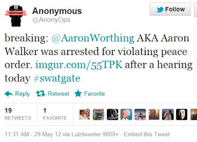 The “@AnonyOps” Tweet was sent at 11:31 a.m. Tuesday, just half an hour after Judge Vaughey’s ruling was issued, and was re-Tweeted 12 minutes later by “@OccupyRebellion,” another Twitter account believed to be associated with Rauhauser and/or Kimberlin.
