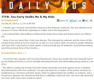 Deciding that he was now a victim, Rauhauser used his posting privileges at the popular liberal blog Daily Kos to complain, “Tea Party Stalks Me and My Kids.” The “threat . . . was directed at me because I’ve been effectively organizing on Twitter and the blogosphere,” Rauhauser wrote on Sept. 28, 2010. “Last weekend this cyberstalking overflowed into kooks discovering and sharing where my children live.”