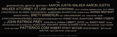 UPDATE III: Want to see something that completely exposes the dishonesty of Team Kimberlin? As I explained Thursday, Neal Raushauser has been obsessed with Patterico for nearly a year, and this obsession is shared by the site I call “Not Brett Kimberlin,” which denies its association with Kimberlin, even as it relentlessly targets the people on Kimberlin’s (and Rauhauser’s) enemies list. Here is the topic-cloud from that site: