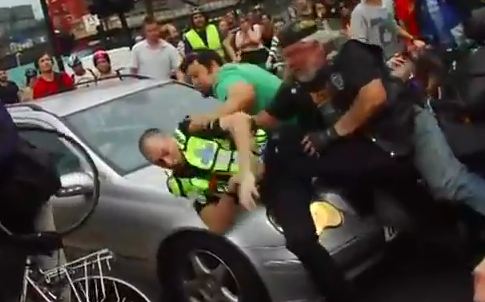 The alleged violation of their “civil rights,” you see, justifies the protesters in disrupting traffic and attacking police. Hat-tip to Tom Lamb for this video which, according to the protesters, shows police brutality against a man in a wheelchair but looks to me more like a bunch of smelly Occupy scum assaulting a cop: